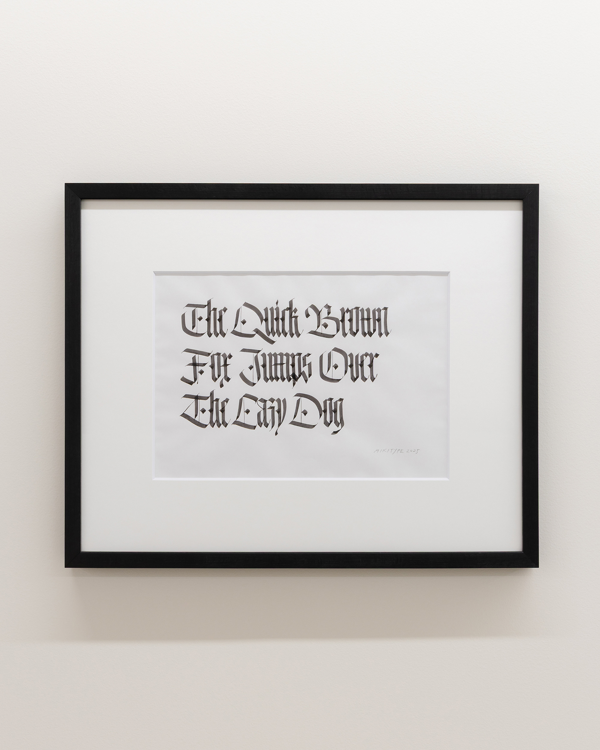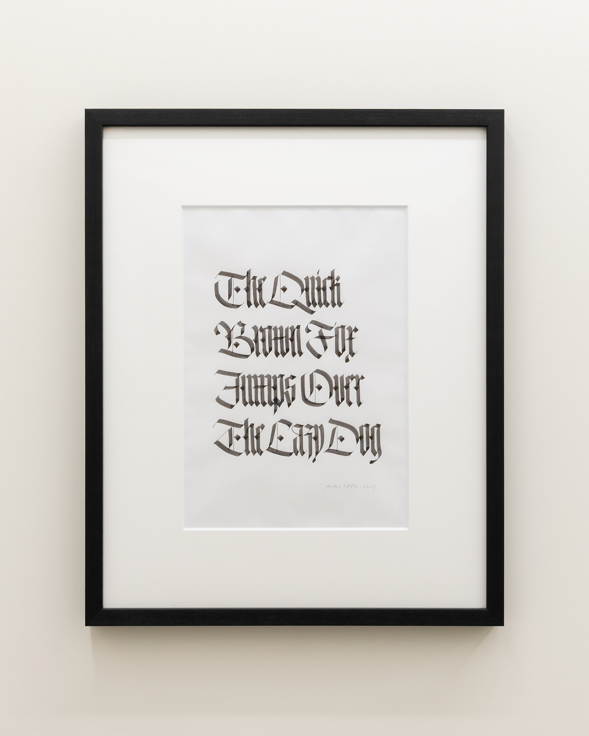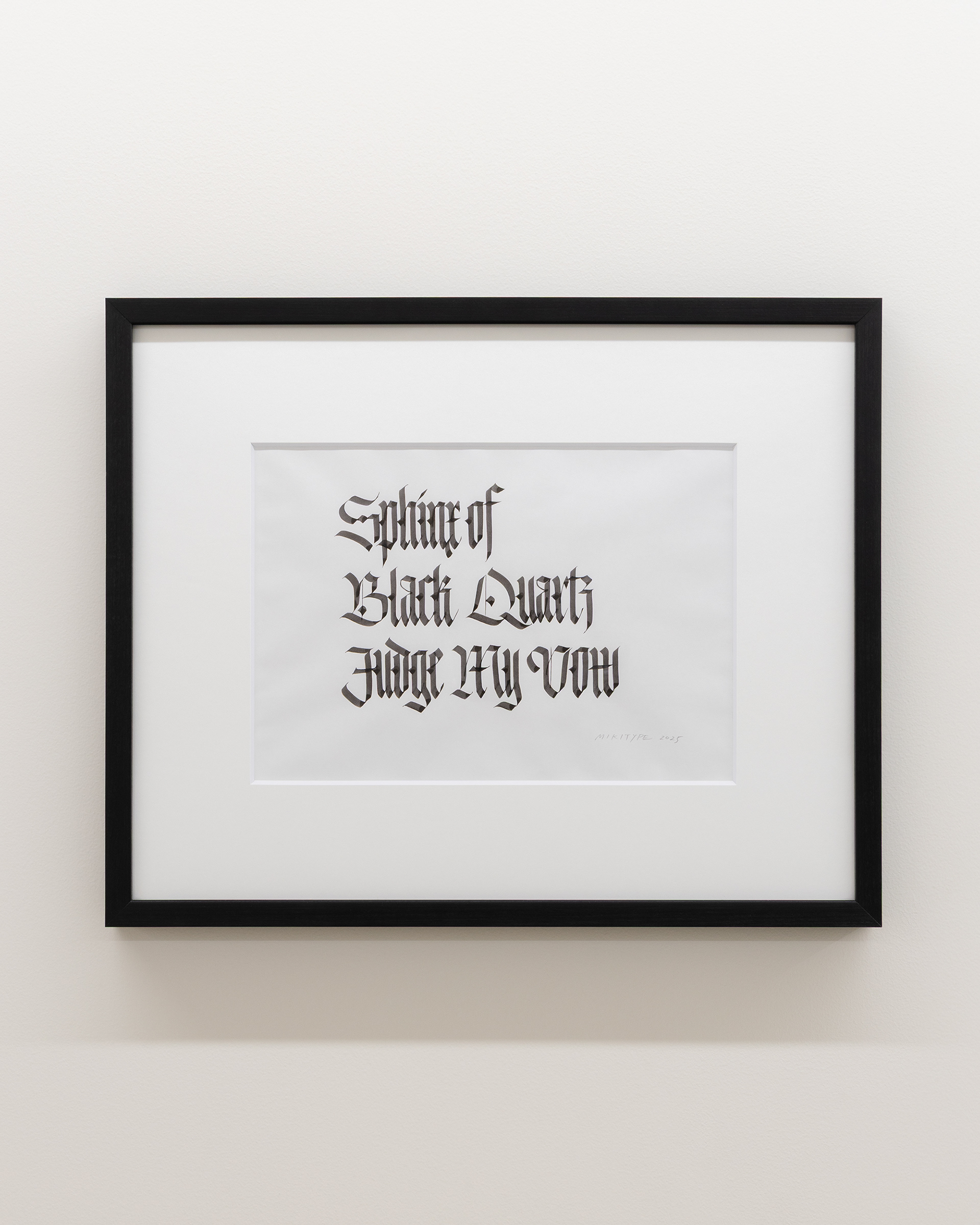 12世紀ヨーロッパの修道院文化の中で、羊皮紙を節約するために縦に圧縮された直線的な造形へと発展したブラックレターという書体がある。その硬質な形態は、永続性と秩序を宿す建築的な文字として、言葉を形象化した。グーテンベルク聖書に代表されるように、印刷文化においてもブラックレターは普遍性を帯び、「Quartz 石英」のごとき恒久的な象徴性を担った。